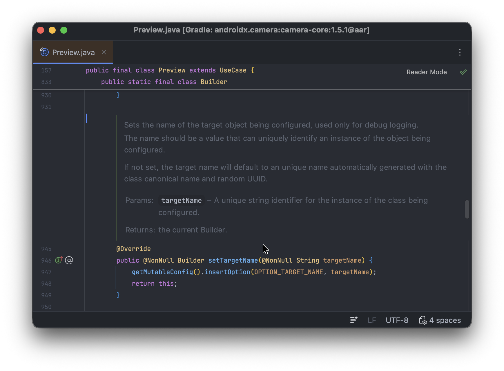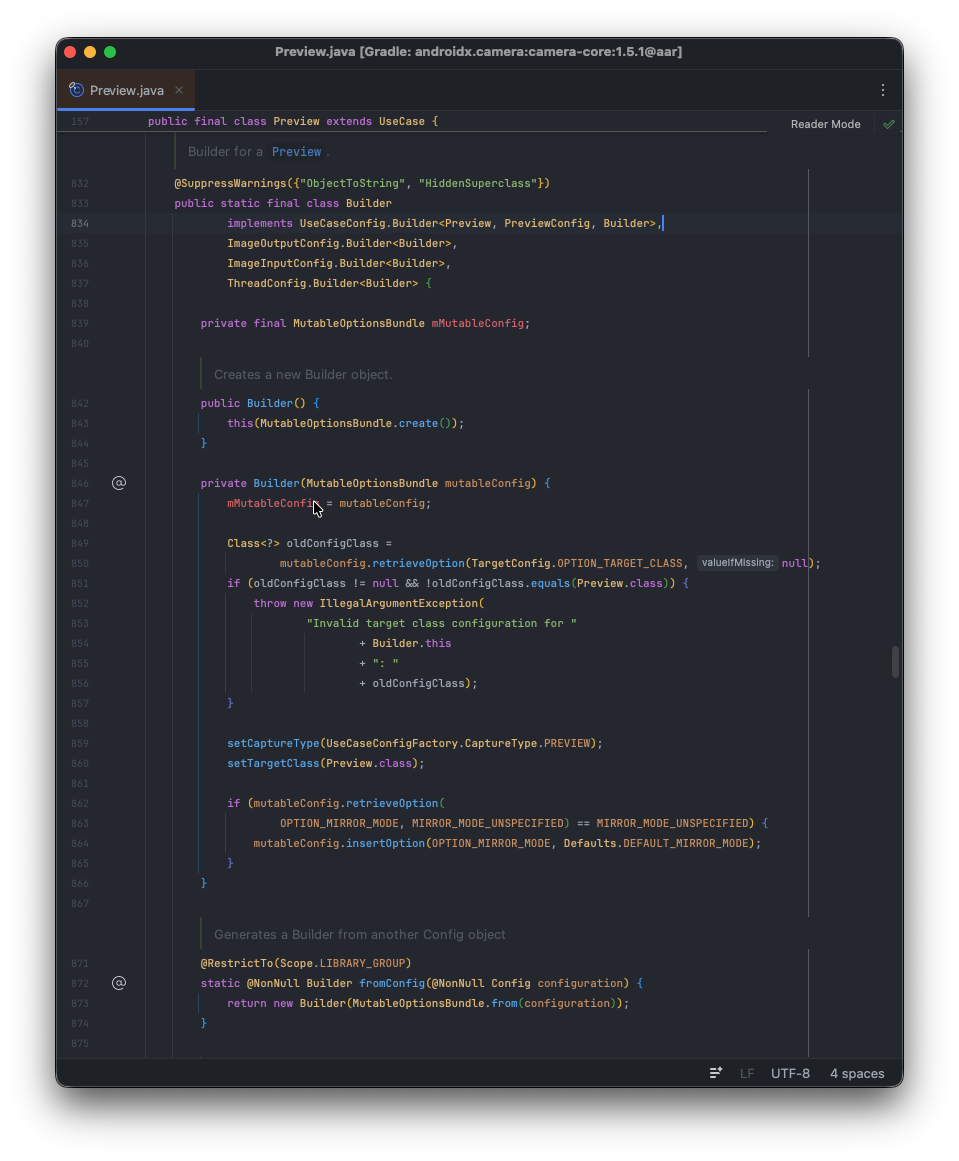CameraX의 UseCase로 Preview를 추가할 때, 개발자는 여러가지 옵션을 지정하여 구성할 수 있으며, 이때 손쉽게 구성할 수 있도록 Builder 패턴을 제공하고 있습니다.