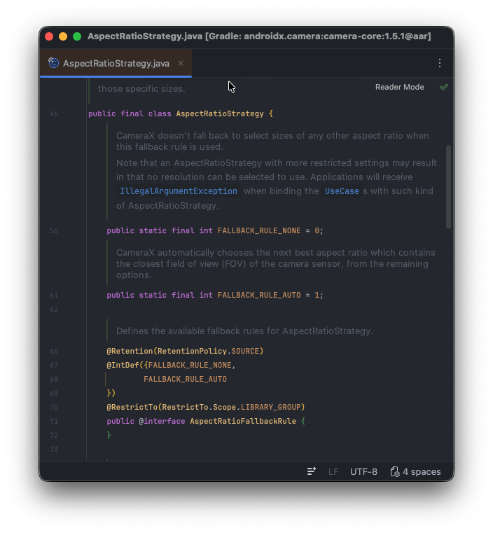 해당코드를 자세히 살펴보면, AspectRatioStrategy는 생성자를 통해 원하는 값을 주입하도록 구성할 수 있지만 한편으로 RATIO_4_3_FALLBACK_AUTO_STRATEGY 와