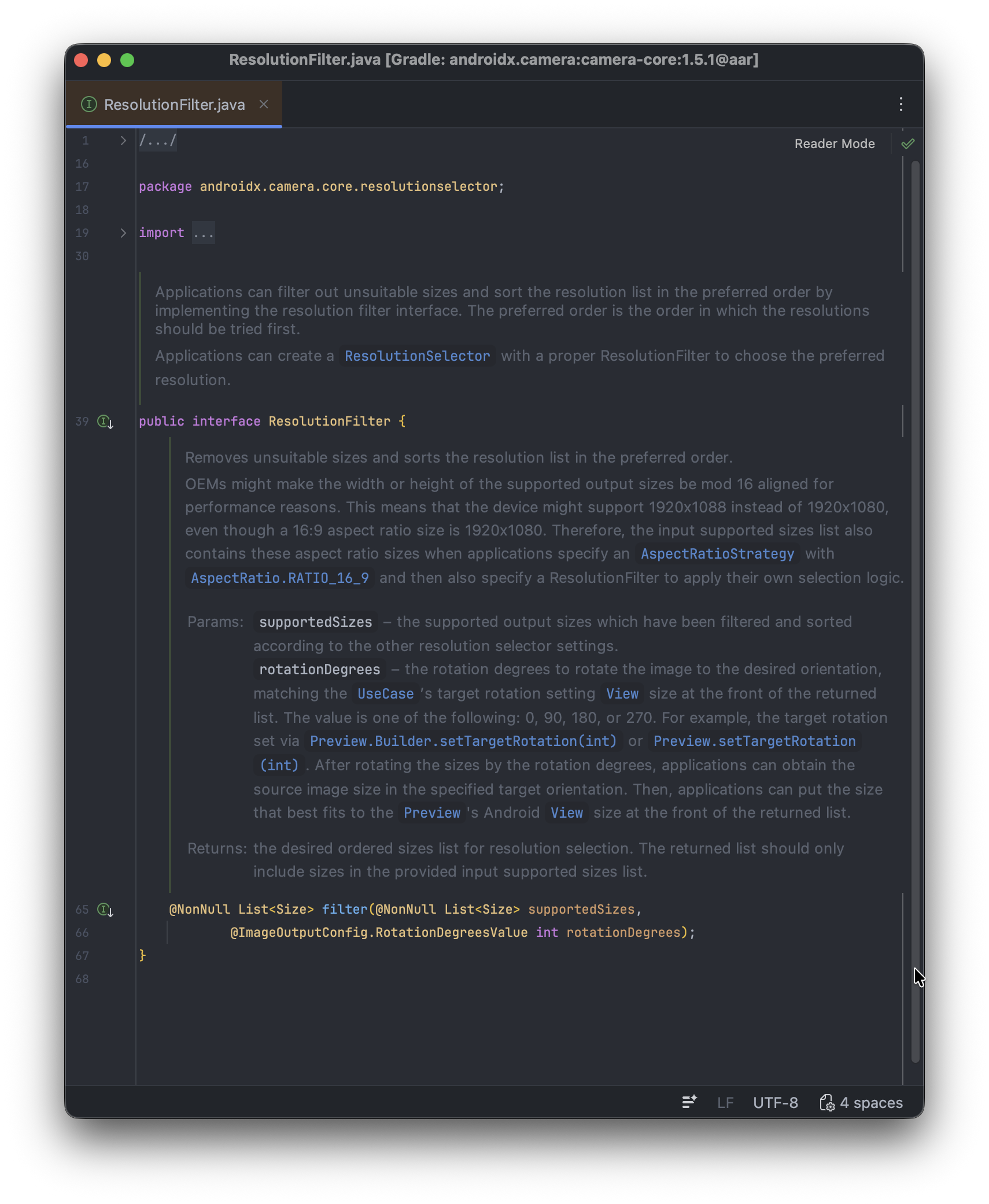 filter의 인자 중 supportedSizes는 앞선 전략에 의해 1차적으로 걸러진 해상도 목록을 의미하며, rotationDegrees는 현재 Preview의 목표 회전 각도를 의미합니다.