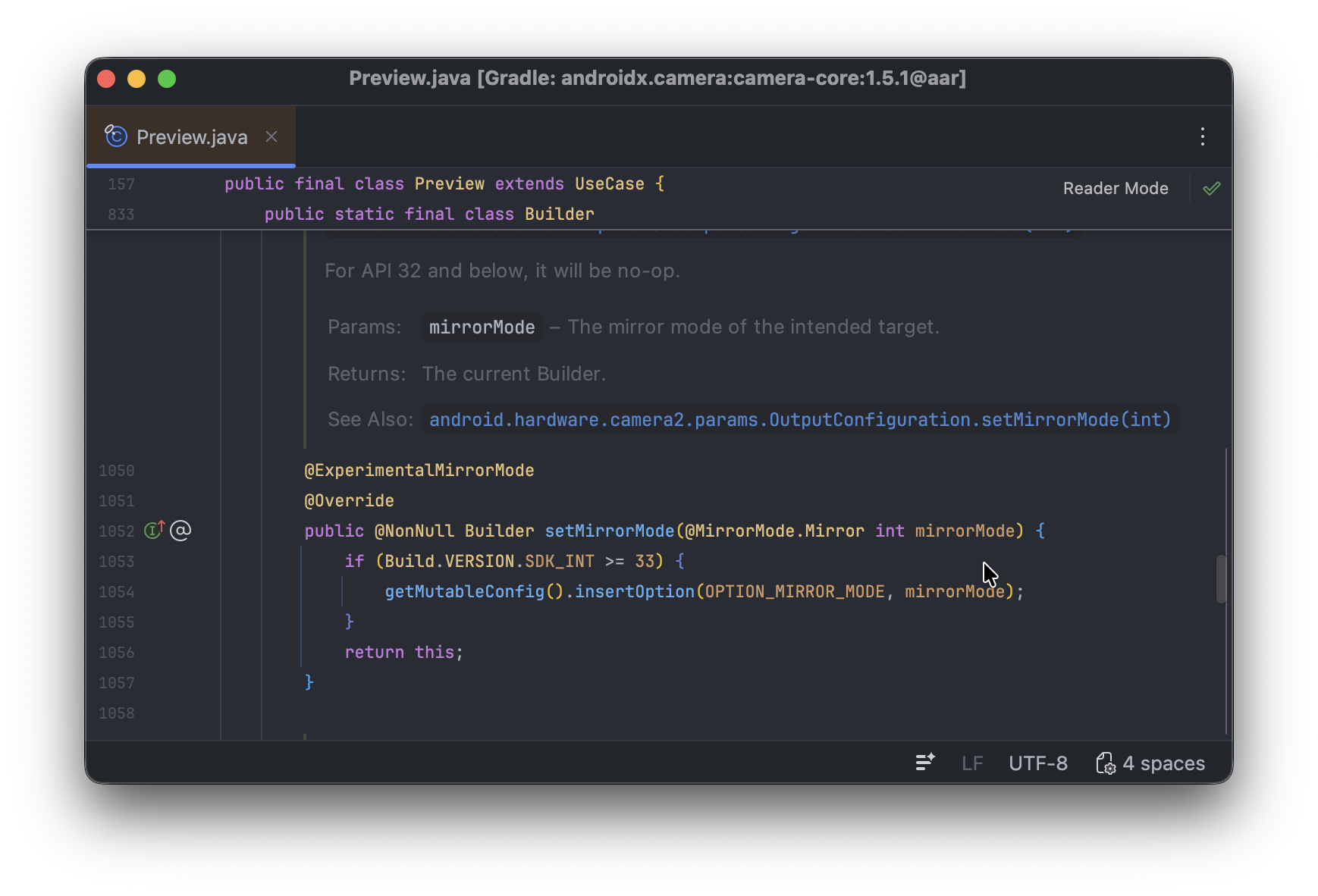 Preview.Builder()에서 setMirrorMode()에 거울모드 관련 상수 값을 지정하여 옵션을 구성할 수있습니다.