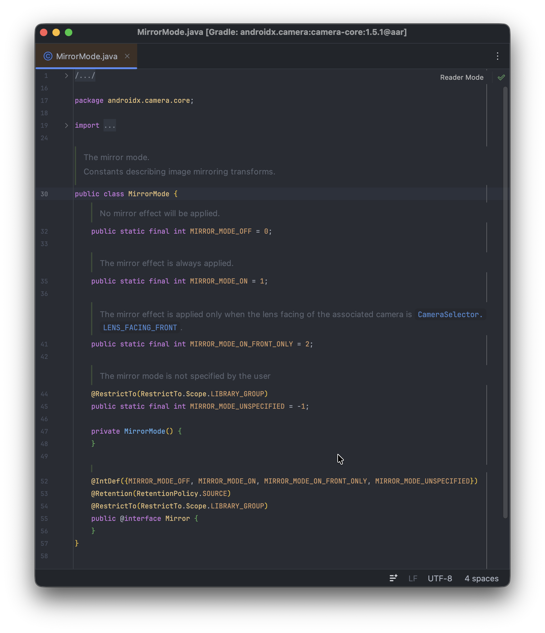 미러 모드의 기본 값으로 미러 효과는 카메라의 렌즈 방향이 CameraSelector.LES_FACING_FRONT일 때만 적용되도록 설정합니다.