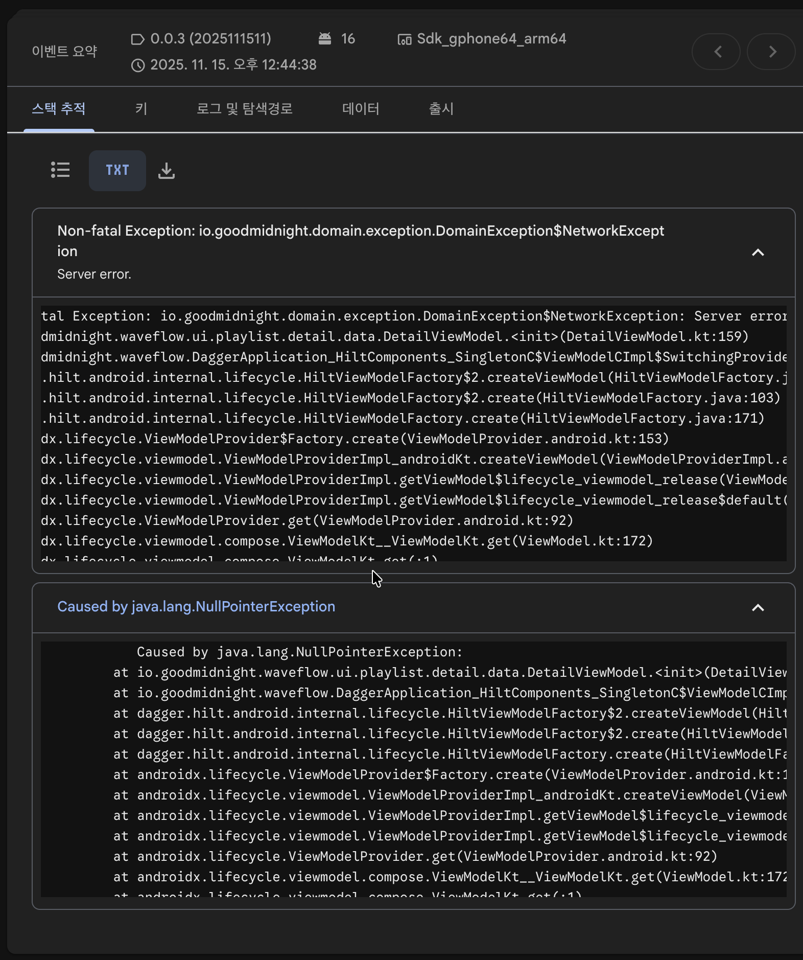 실제로 handleError()가 동작되도록 예외를 발생시키면 아래와 같이 Firebase Crashlytics 시스템의 심각하지 않음 유형으로 이벤트가 기록된 것을 확인하실 수 있습니다.